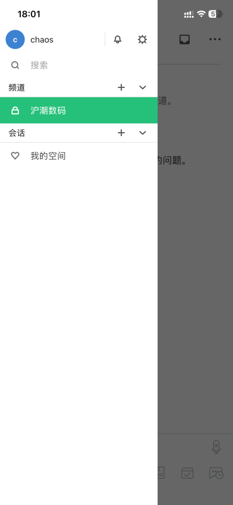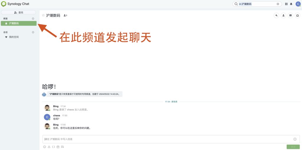 地址填写:chat.leebruce.cn,用户名和密码同上,保持HTTPS和我是访客两个选项是关闭状态。登录成功之后点击左上角菜单按钮找到沪潮数码频道。